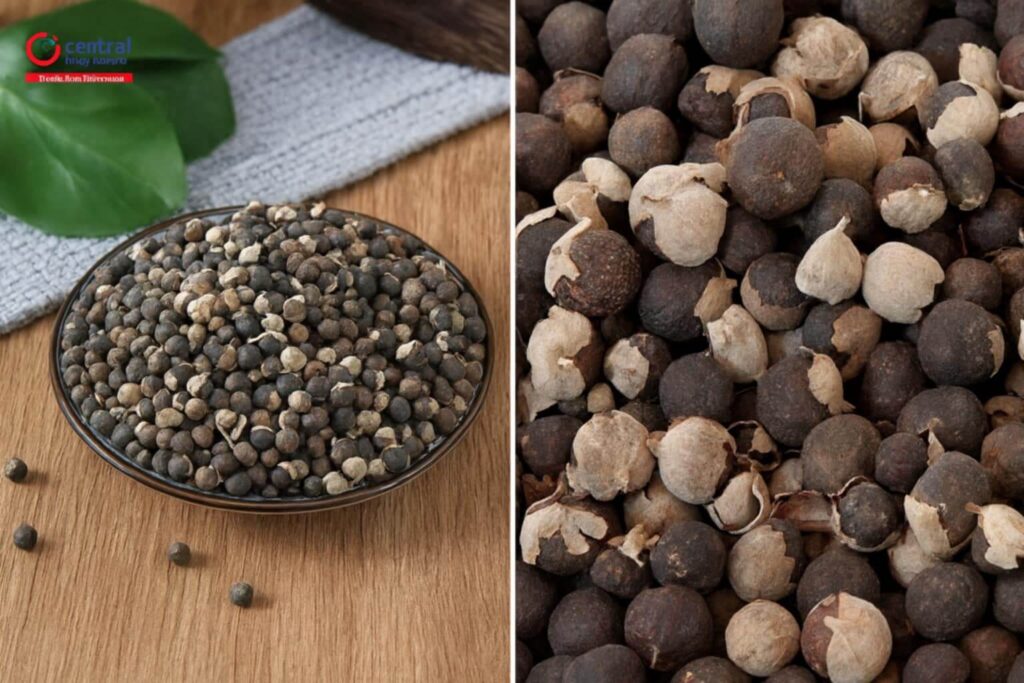 • Hình dáng: Quả nhỏ, hình cầu, đường kính khoảng 3–5 mm, khi chín có màu tím đen, bên trong chứa 4 hạt nhỏ. Quả khô, bề mặt hơi nhăn, khi cầm có mùi thơm đặc trưng, vị hơi cay, đắng.